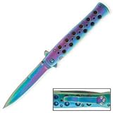 This stiletto style rainbow warrior knife isn't looking for trouble, but it sure won't back down. The 9" folder offers a complete rainbow finish and a pocket flip for convenience. 9" overall. 4" blade. Tomahawk, XL1432