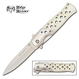 The same elegant look and feet of a custom, handmade folding knife combined with the performance of a precision production cutting edge. The handle is stainless steel construction with imitation Mother of Pearl overlay accented with balance holes. The brushed satin blade is constructed from solid stainless steel and is equipped with handy thumb stud for easy one hand operation. 4" blade, 8 7/8" overall