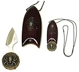 Spider Neck Knife Antique Bronze finished metal handle with 3D cast spider on both sides Scabbard: Hardwood with spider web carved on both sides 3-7/8" long ,1-1/4" Wide Knife 3.0" overall length, Stainless Steel 24" Black Metal Ball Neck Chain